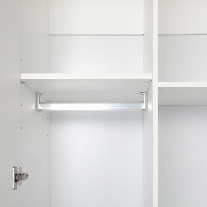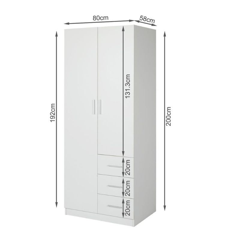 Armario ropero de dormitorio con un diseño moderno y funcional, acabado en elegante color blanco. Dispone de dos puertas con bisagras amortiguadoras y tres cajones inferiores que ofrecen una excelente capacidad de almacenamiento para mantener la ropa y los complementos perfectamente organizados. Gracias a su estilo neutro y sus dimensiones equilibradas, es una solución ideal para dormitorios juveniles, de matrimonio o habitaciones auxiliares, aportando orden, practicidad y un aspecto limpio y actual.