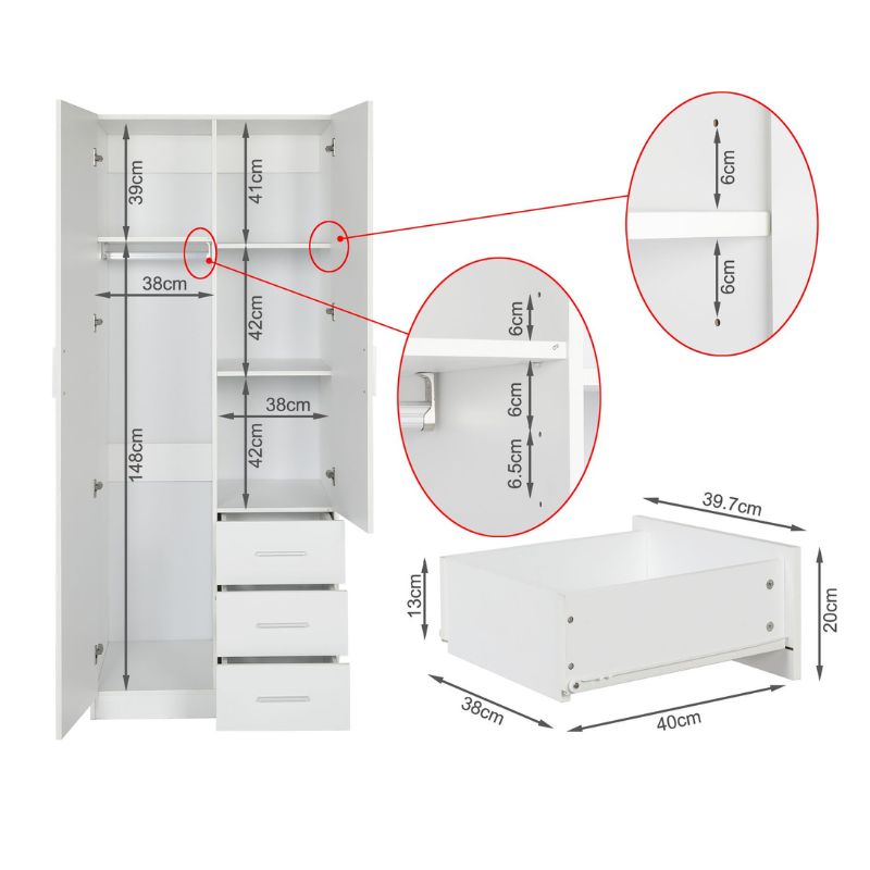 Armario ropero Blanco 200x80x58 cm con 2 puertas y 3 cajones