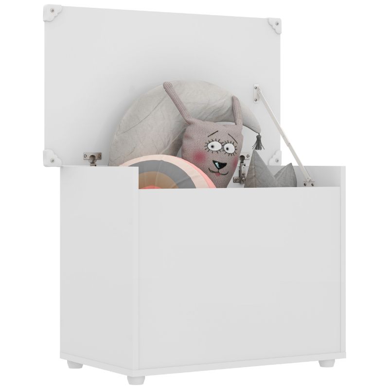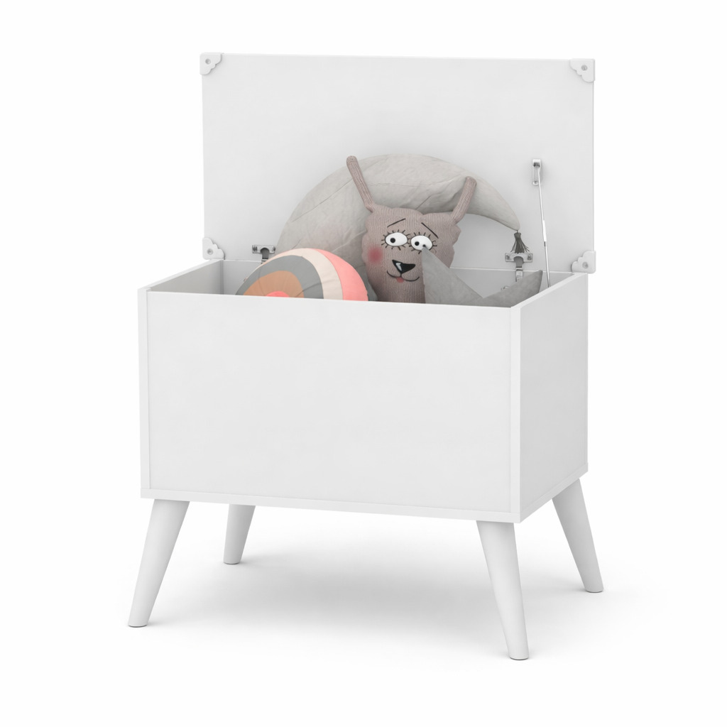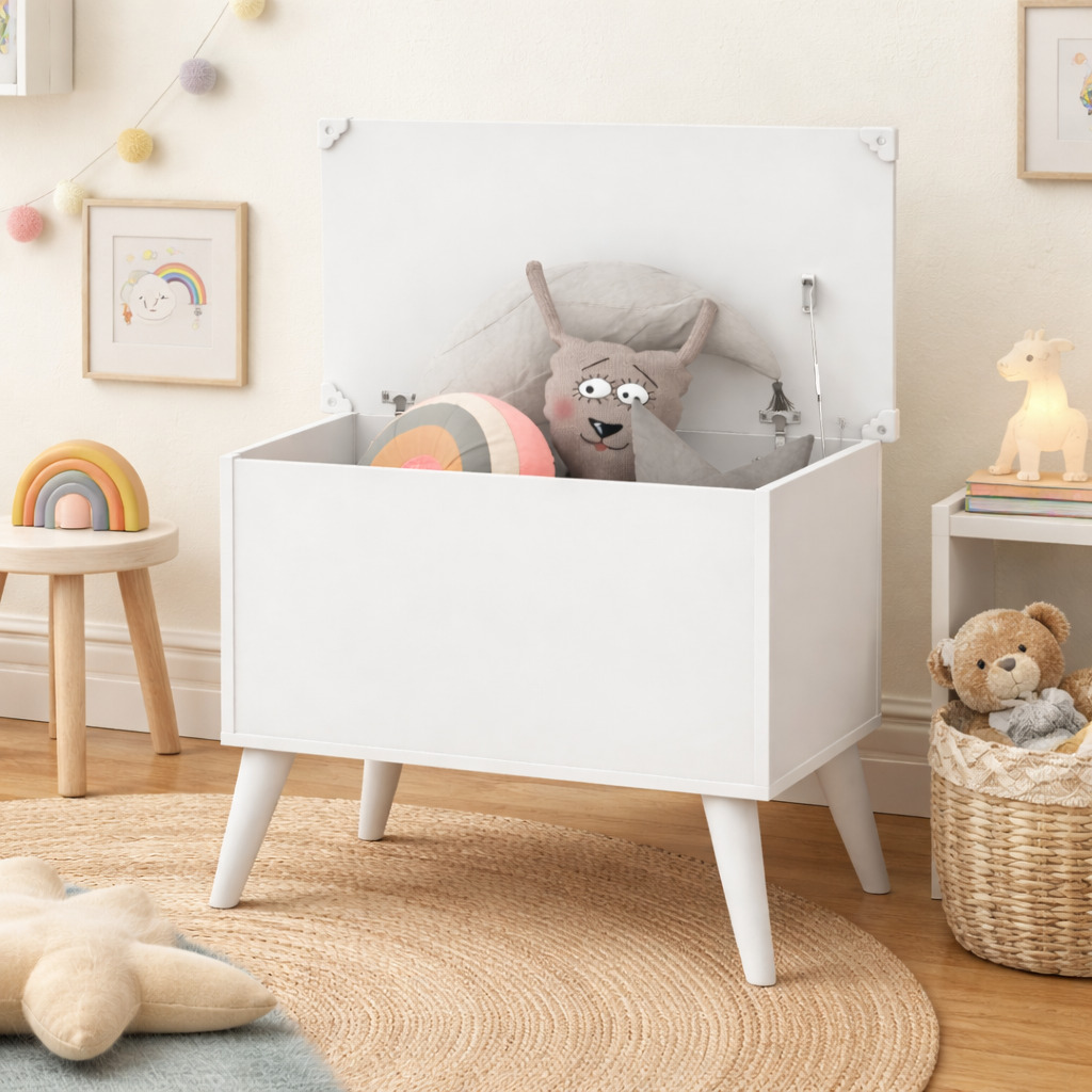 Baúl de almacenamiento acabado en color blanco, con un diseño moderno y funcional. Proporciona un espacio práctico para organizar ropa, juguetes, accesorios u otros objetos del hogar. Su tamaño compacto y estilo neutro lo hacen ideal para cualquier habitación, aportando orden, comodidad y un aspecto limpio y actual.