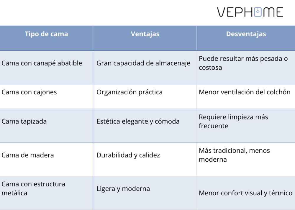 Además del tamaño de la cama, existen muchos tipos diferentes de cama de matrimonio, con una gama infinita de diseños, colores y precios. En primer lugar, algunas camas de matrimonio utilizan una tecnología diferente a la de las camas tradicionales. Las camas modernas se suelen caracterizar con lineas limpias, materiales naturales y ser funcionales. Te enseñamos una tabla comparativa de ventajas y desventajas según el tipo de cama: