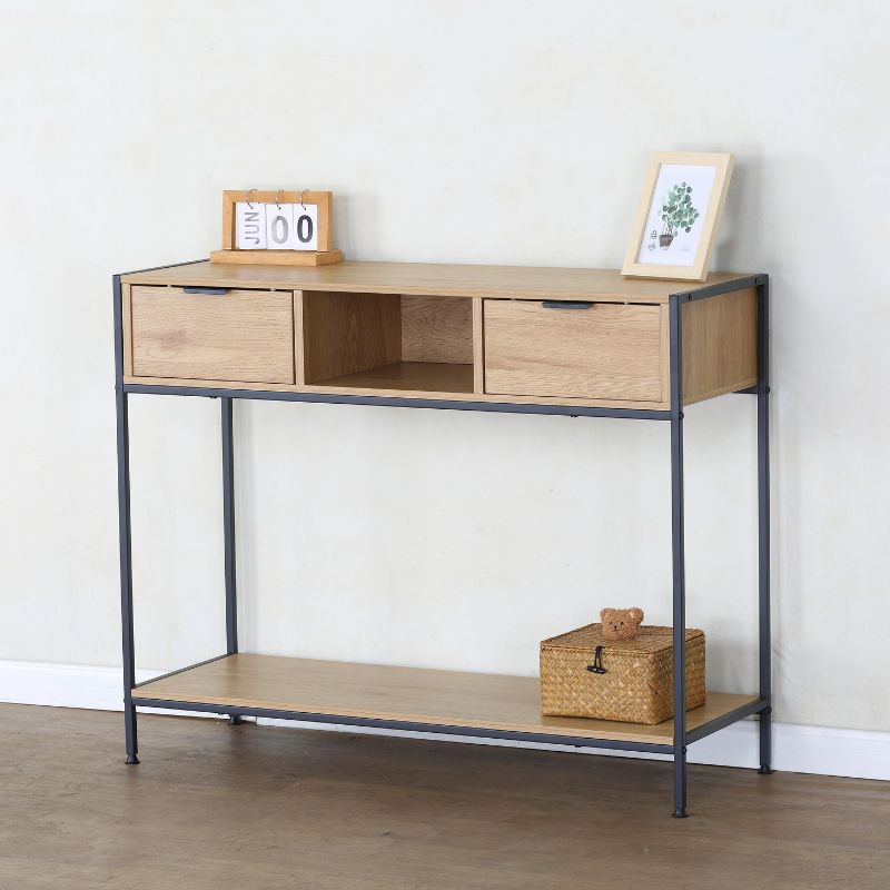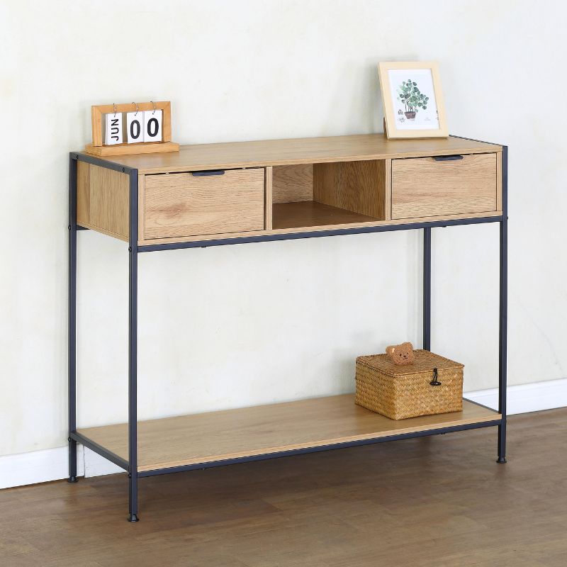 La consola metálica es la solución perfecta para aportar estilo y funcionalidad a recibidores, pasillos o salones. Su diseño combina una resistente estructura metálica con un elegante acabado en Roble, logrando un equilibrio ideal entre estética moderna e inspiración industrial. Dispone de 2 cajones y 1 hueco abierto, ideales para mantener organizados llaves, correspondencia, accesorios o elementos decorativos, manteniendo el espacio siempre ordenado.