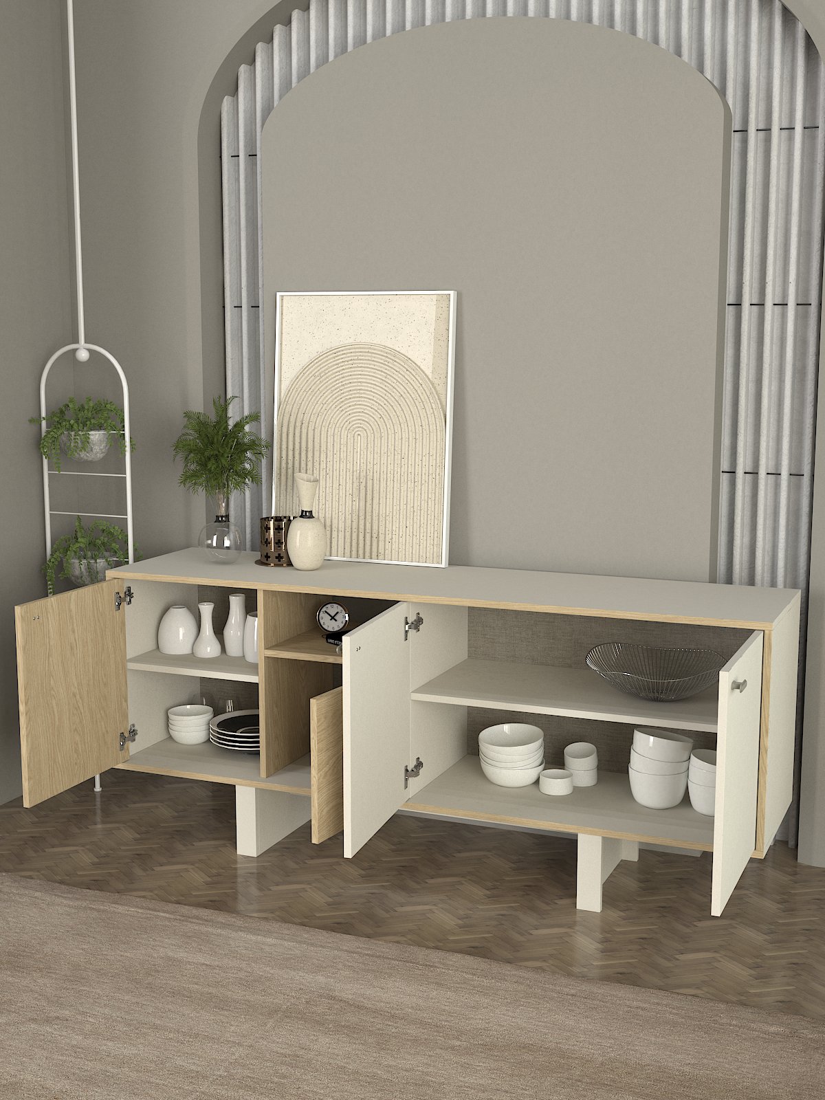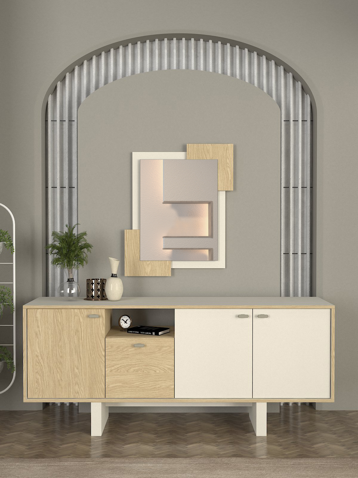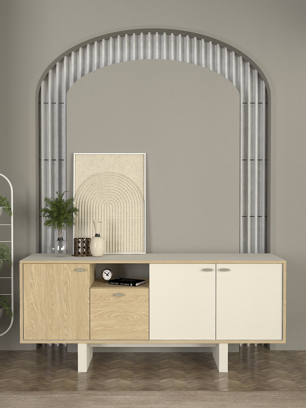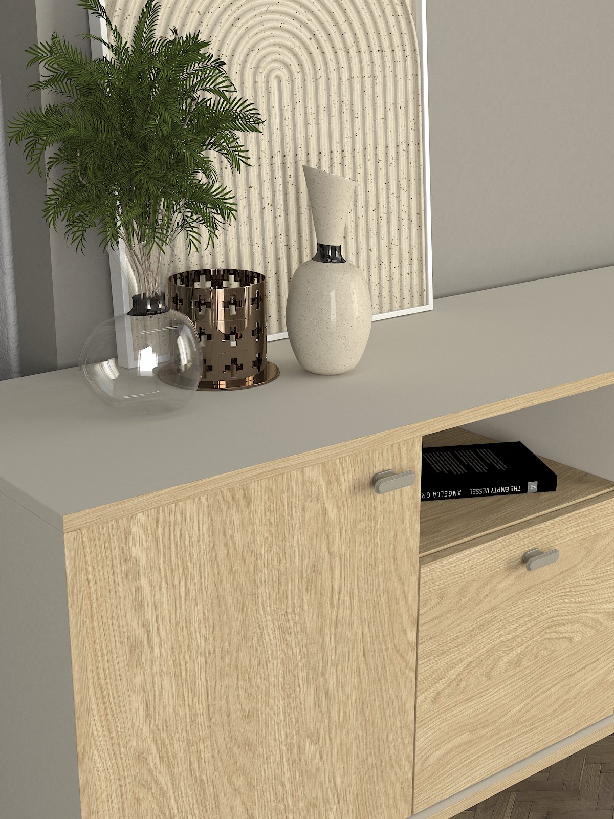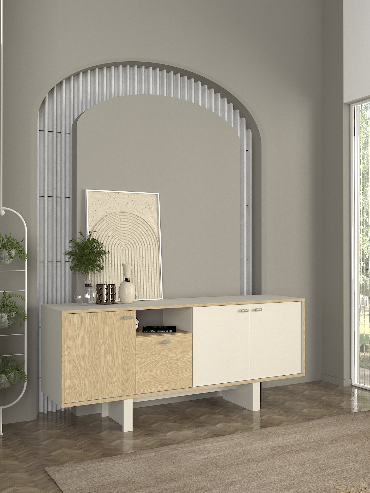 Consola en acabado Sandstone Rota ideal para recibidor, pasillo o detrás del sofá. Sirve como apoyo para llaves y accesorios, y también como base para elementos decorativos como espejos, lámparas o jarrones. Una pieza ligera visualmente que aporta orden y estilo.