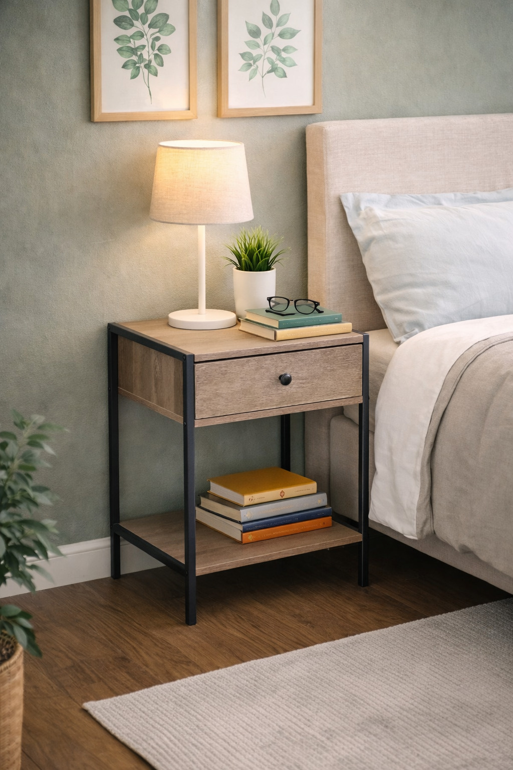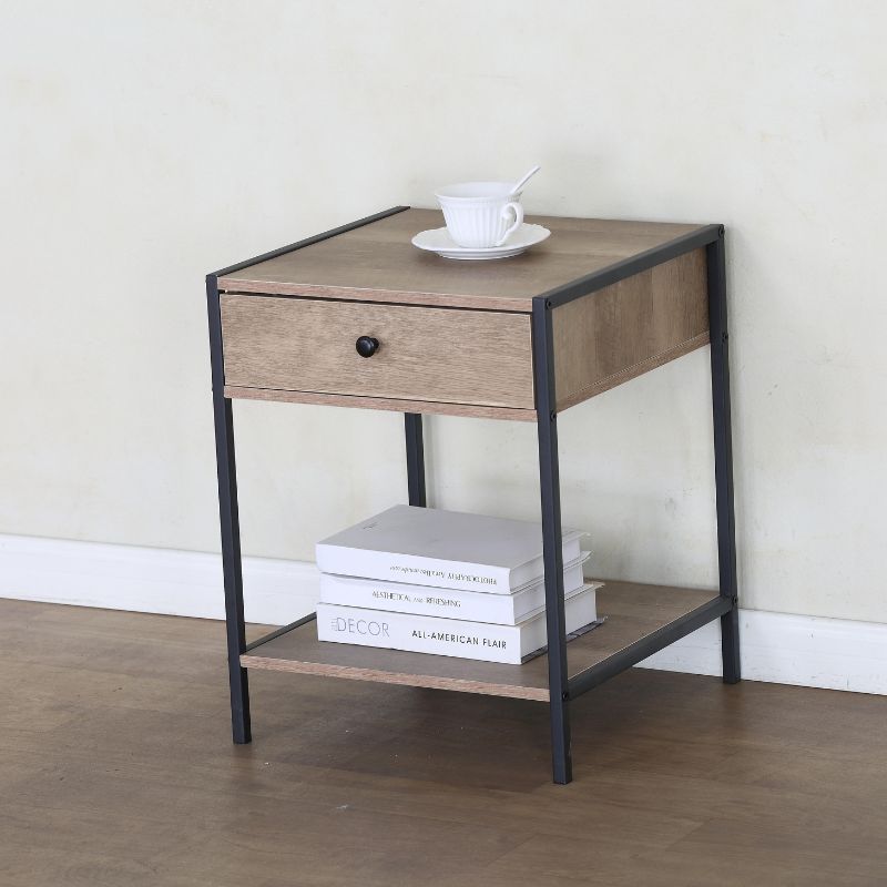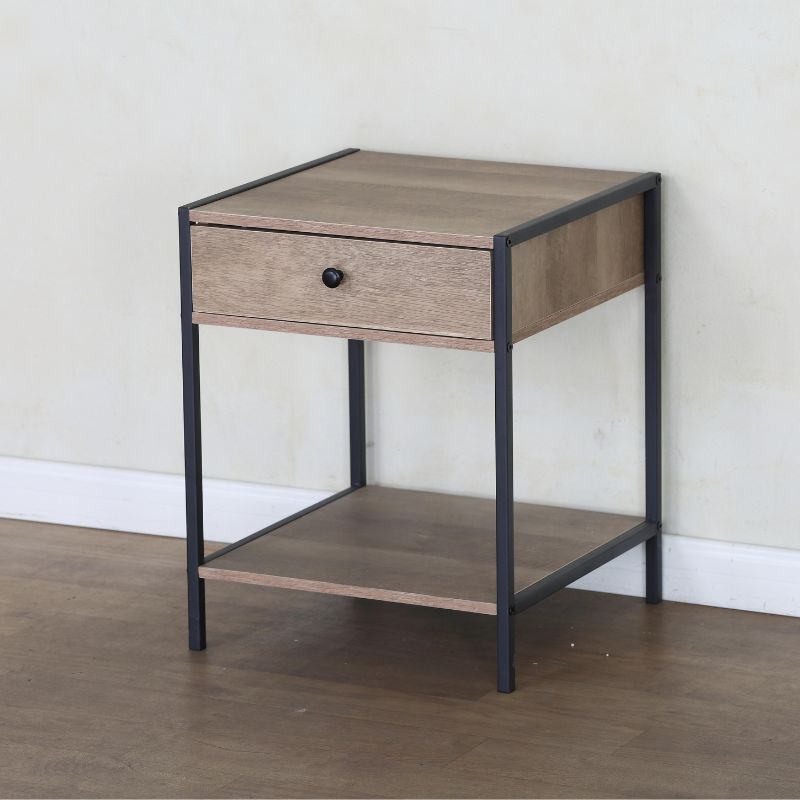 La Mesita en acabado Roble es el complemento perfecto para darle estilo y organización a tu dormitorio o sala de estar. Su diseño moderno combina un cajón y un espacio abierto, ideales para mantener a mano tus objetos personales, libros, accesorios o decoración. Con medidas compactas de 50 × 40 × 40 cm, es perfecta para usar como mesa de noche o mueble auxiliar. Su estructura con detalles metálicos aporta un toque contemporáneo que realza cualquier ambiente. Práctica, elegante y multifuncional: una pieza que se adapta a tu estilo y a tu espacio.