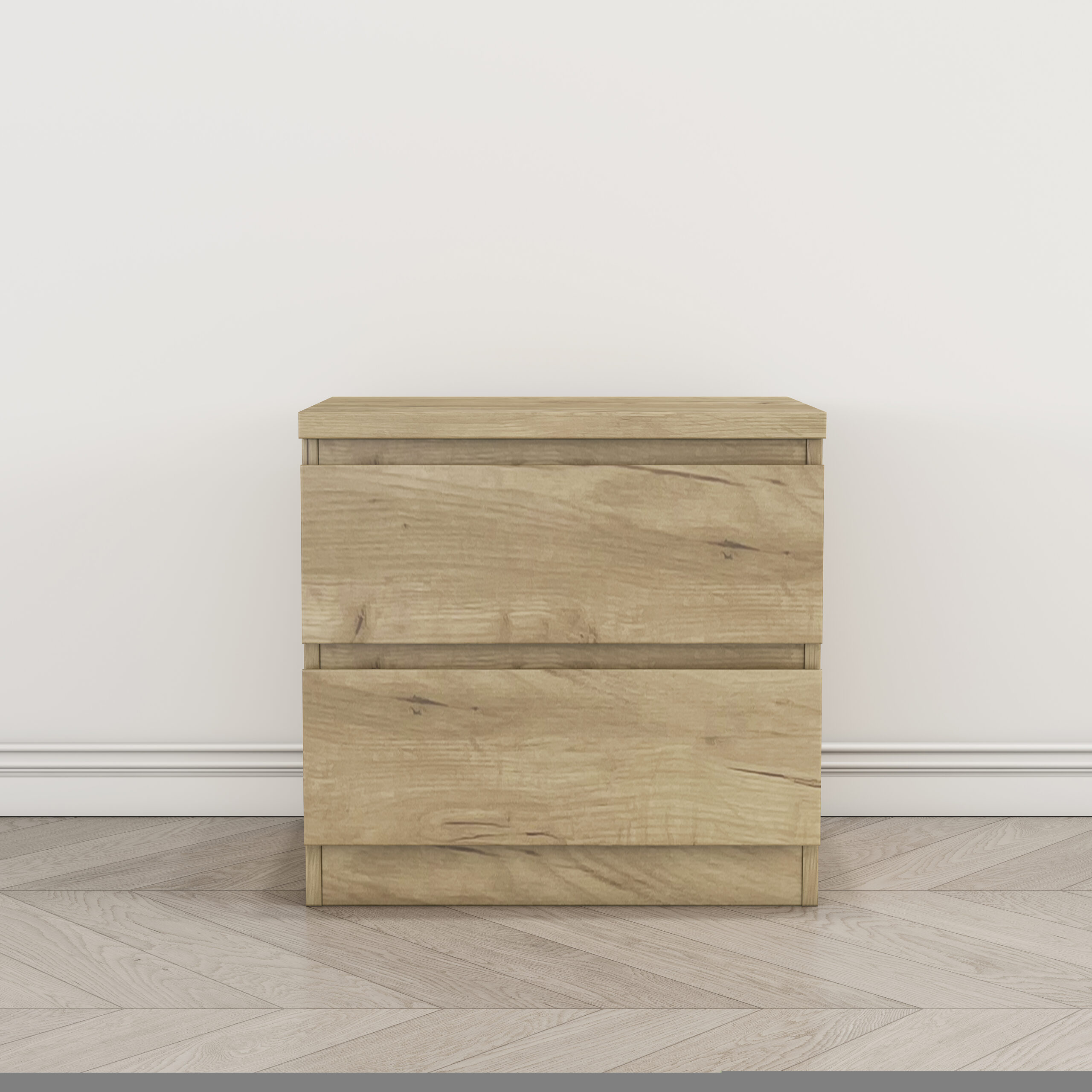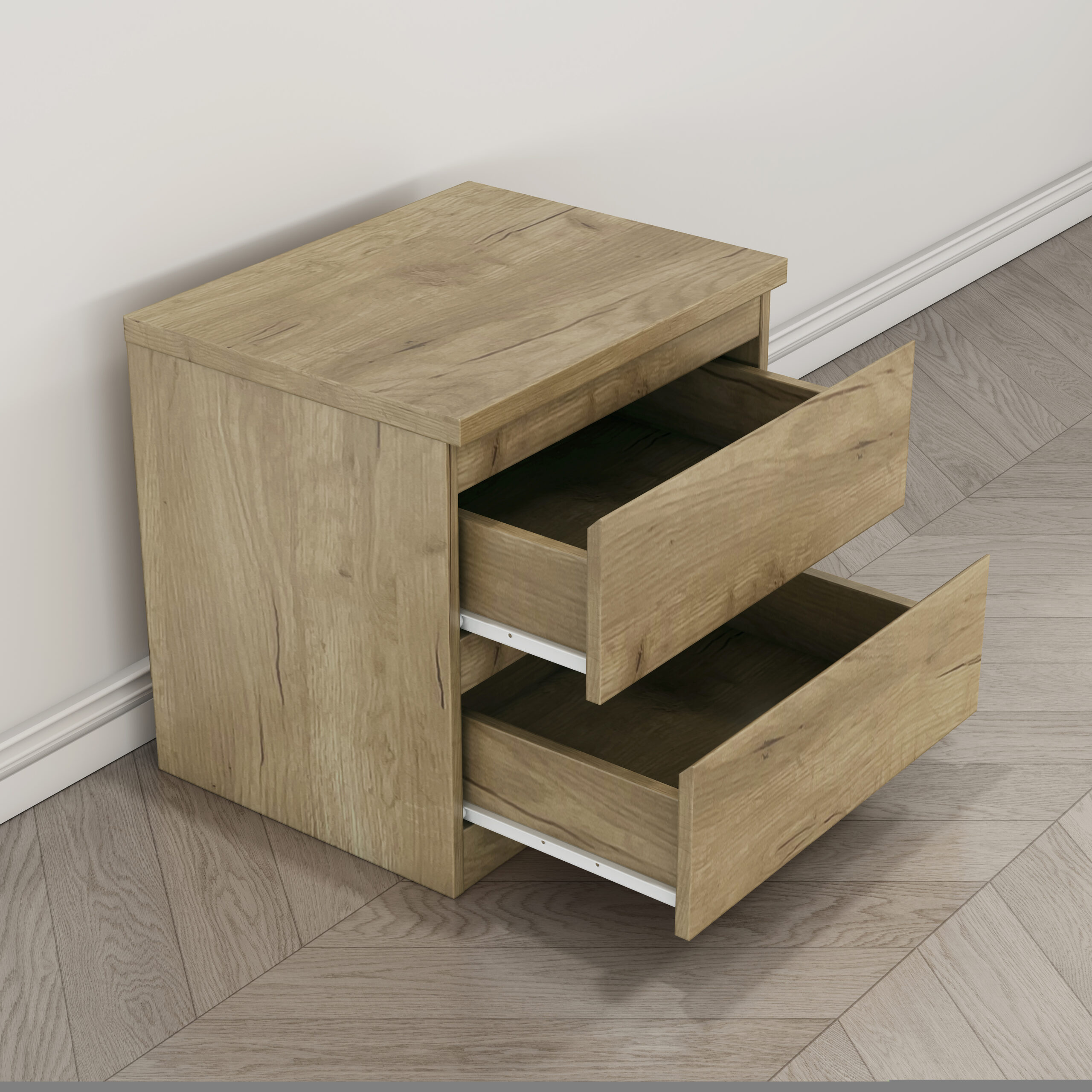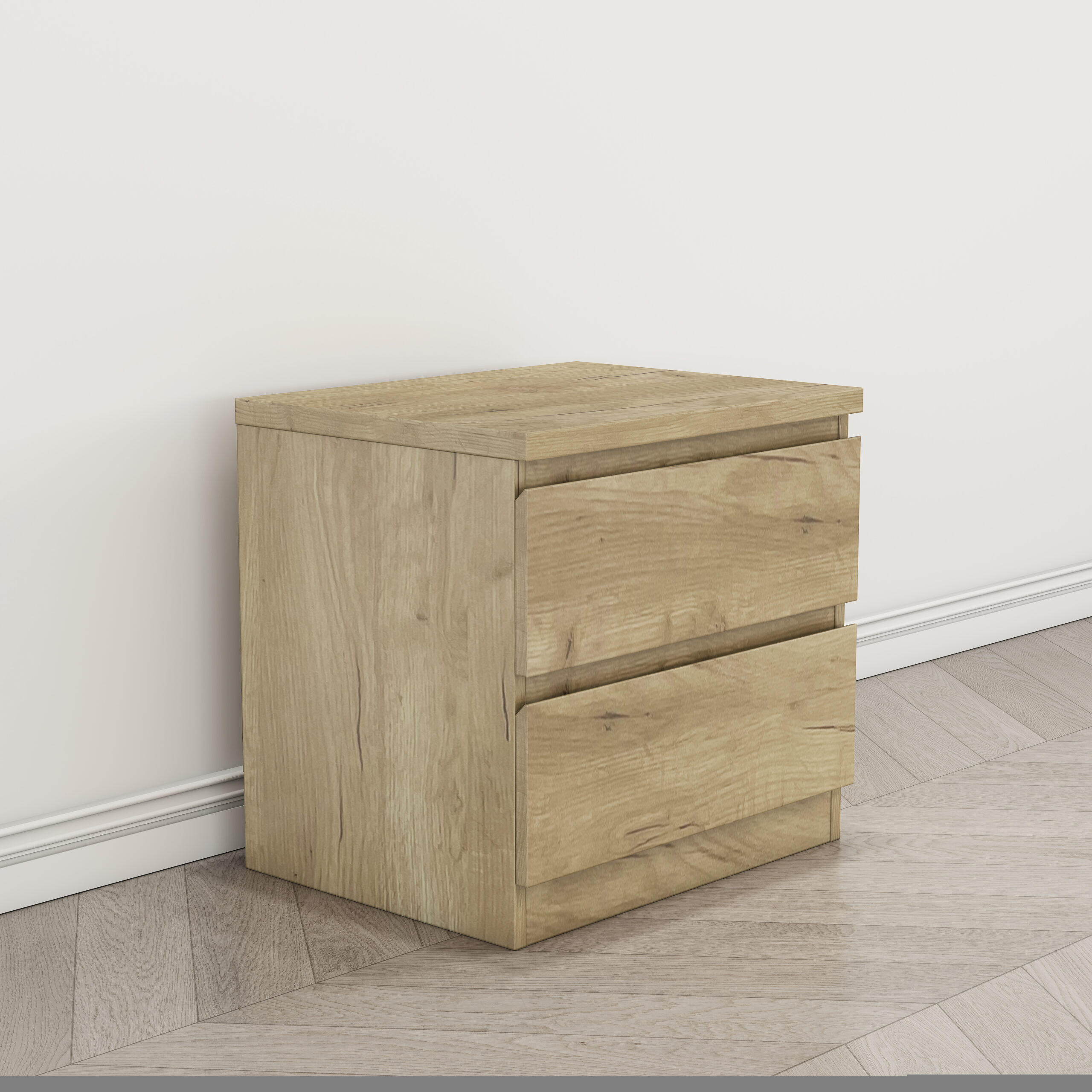 Mesita de noche de diseño moderno y funcional, acabada en color roble. Cuenta con dos cajones que ofrecen un espacio de almacenamiento práctico para mantener el dormitorio ordenado y organizado. Gracias a su tamaño compacto y su estilo neutro, se integra fácilmente en cualquier tipo de dormitorio, aportando comodidad y un aspecto limpio y actual.