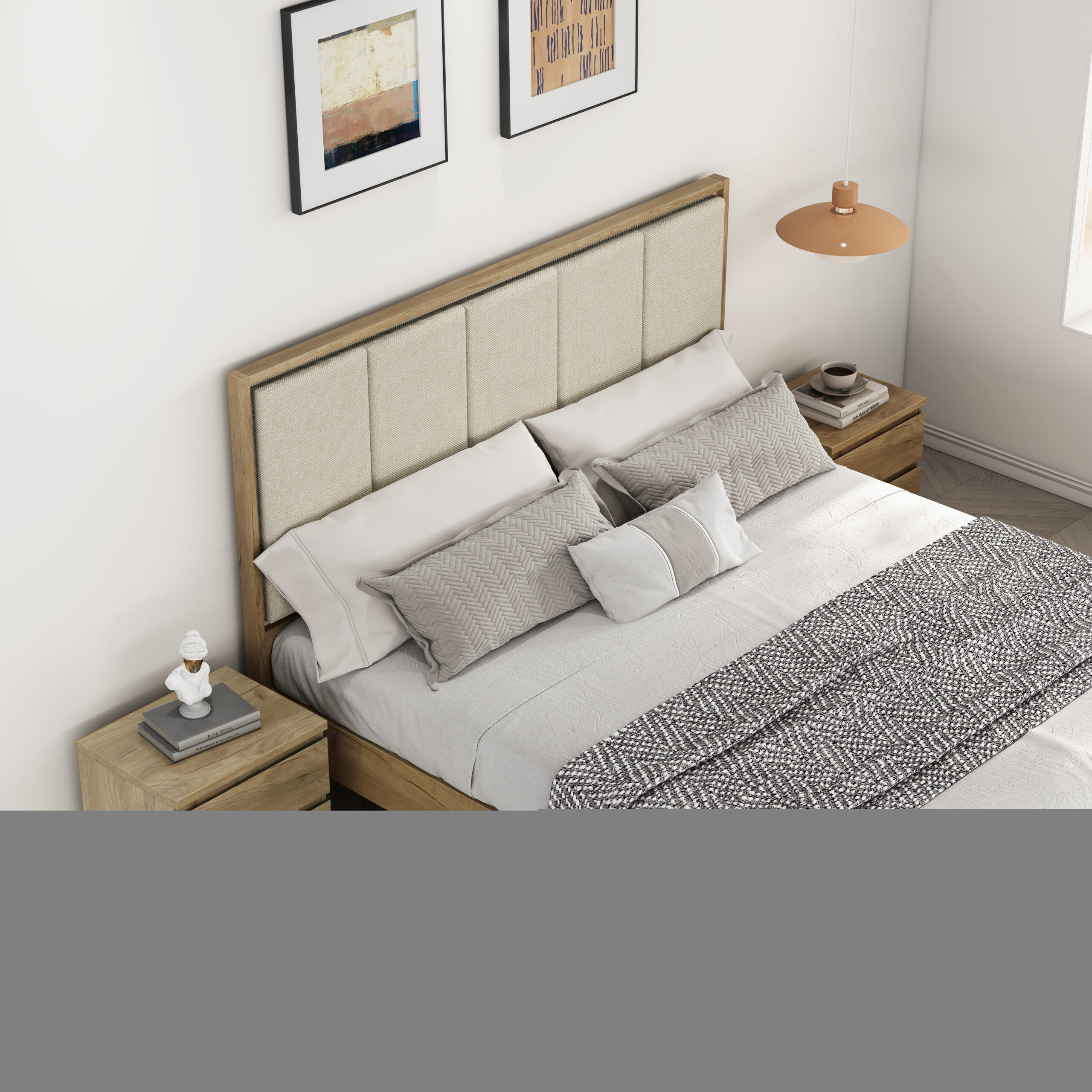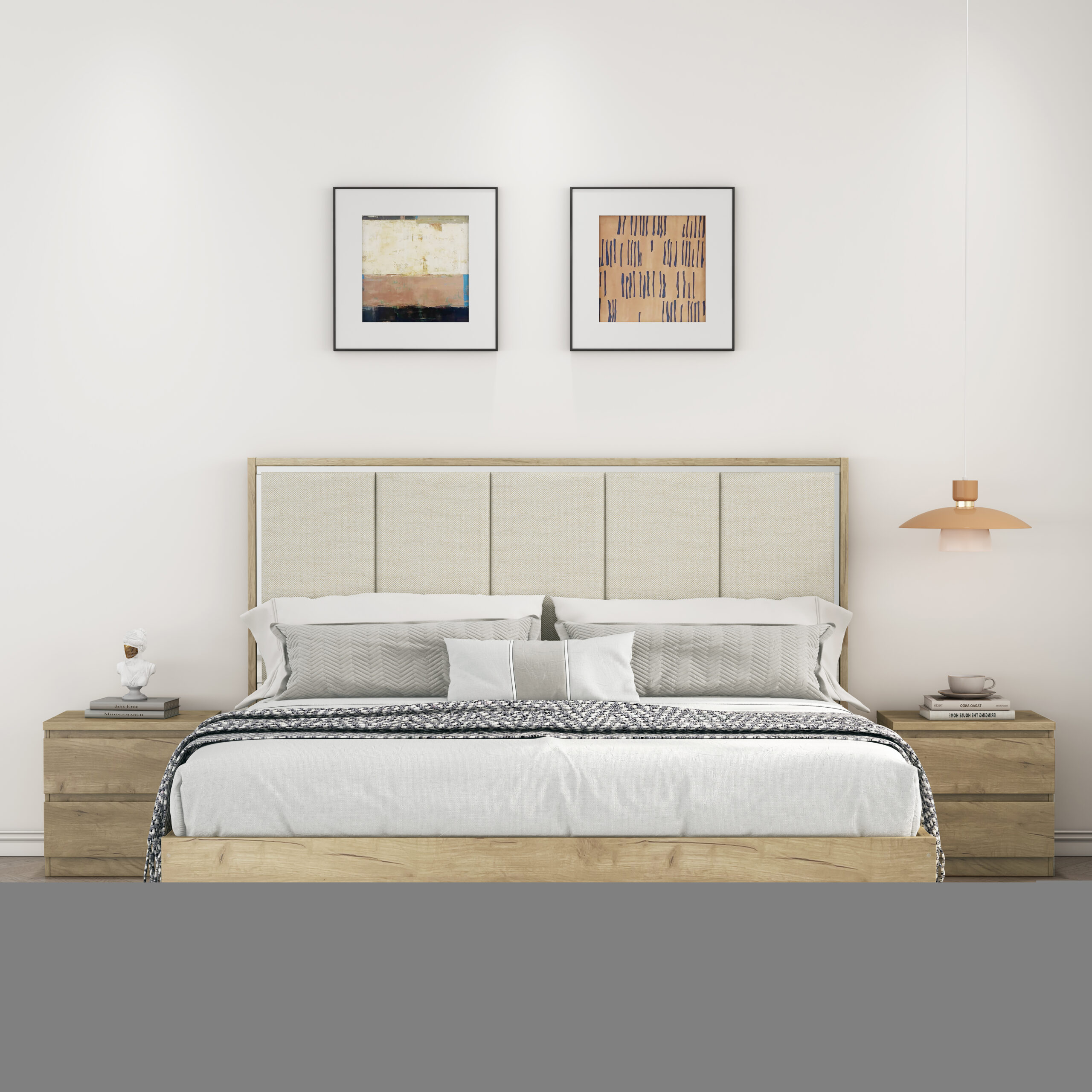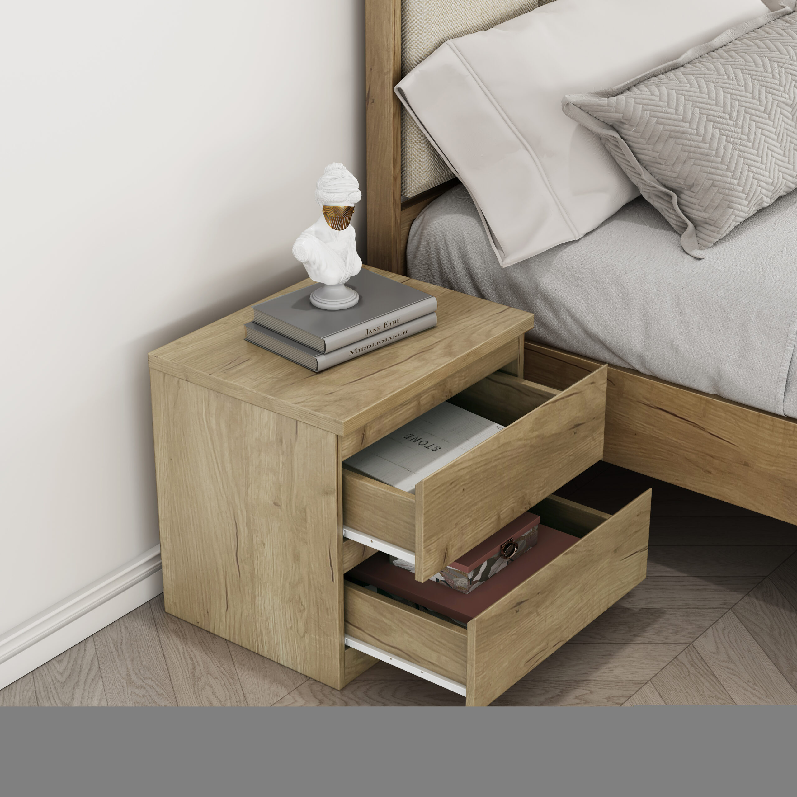 Mesita de noche de diseño moderno y funcional, acabada en color roble. Cuenta con dos cajones que ofrecen un espacio de almacenamiento práctico para mantener el dormitorio ordenado y organizado. Gracias a su tamaño compacto y su estilo neutro, se integra fácilmente en cualquier tipo de dormitorio, aportando comodidad y un aspecto limpio y actual.