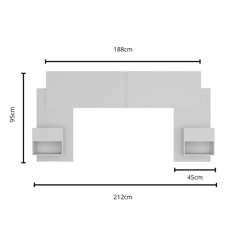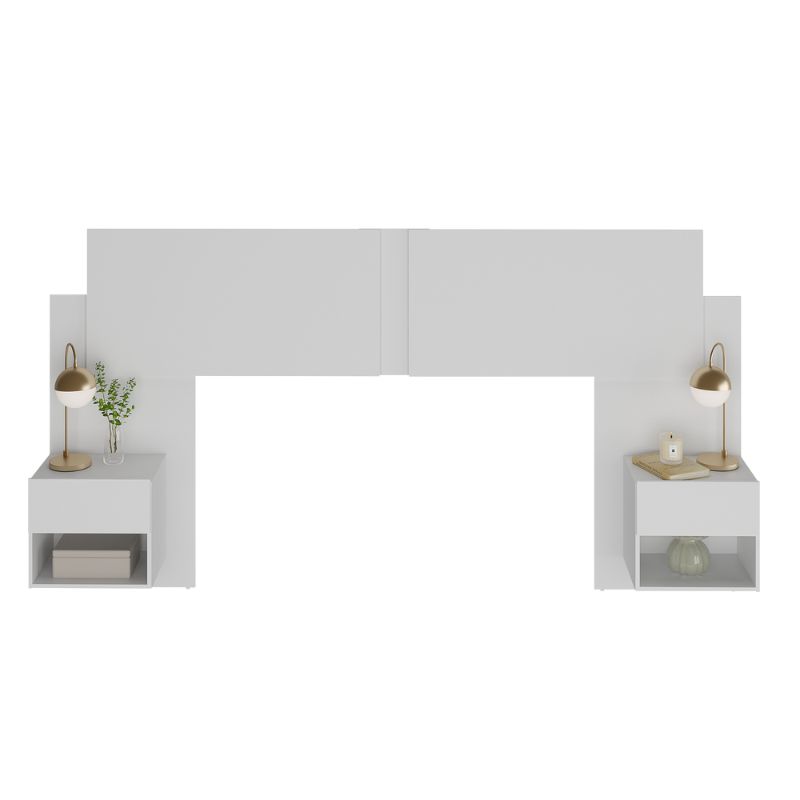Set de dormitorio compuesto por cabezal y mesitas integradas, acabado en color blanco. Este conjunto ofrece un diseño moderno y funcional, aportando estilo y practicidad al dormitorio. El cabezal de 160x92x18 cm proporciona soporte y estética, mientras que las mesitas integradas permiten mantener los objetos personales organizados y al alcance. Ideal para dormitorios, combinando orden, comodidad y un aspecto limpio y actual.