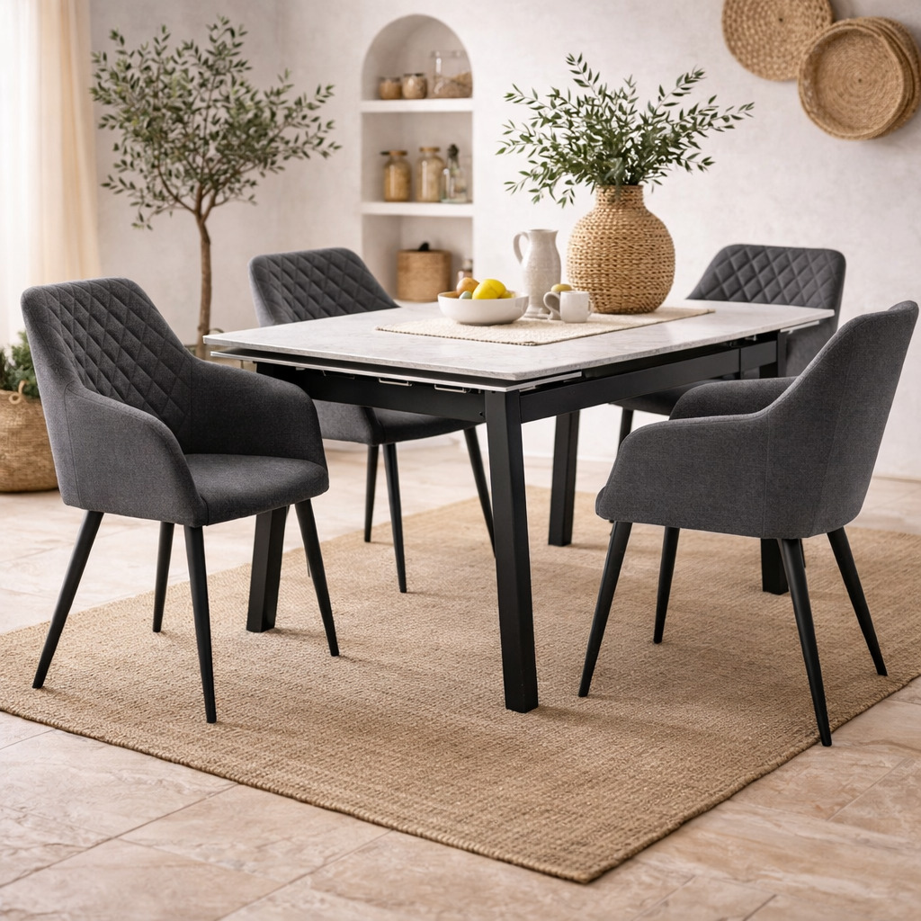 El juego de 2 sillas en color gris con patas negras destaca por su diseño moderno y elegante. Su estética geométrica aporta un toque actual a cualquier comedor, cocina o salón.
